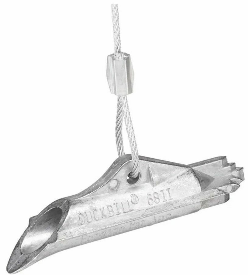 Description: An upward pull on anchors rotates duckbill into a load-lock position approximately 15° from horizontal. Further tension causes anchor to plane sideways through undisturbed soil, increasing holding power. No rods, stakes, pipes, or stems above ground. Made of tinzalloy aluminum alloy, will not corrode or rust. Driving rod required to drive anchor vertically into undisturbed soil to required depth. Order driving rod separately.