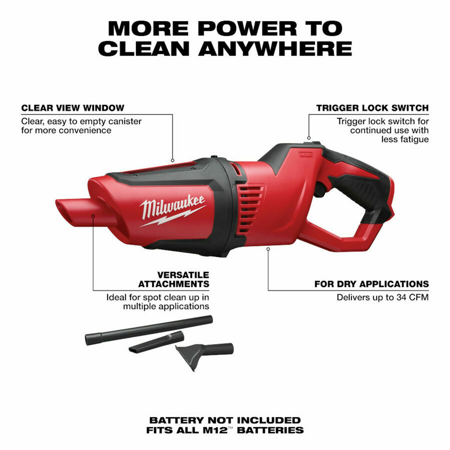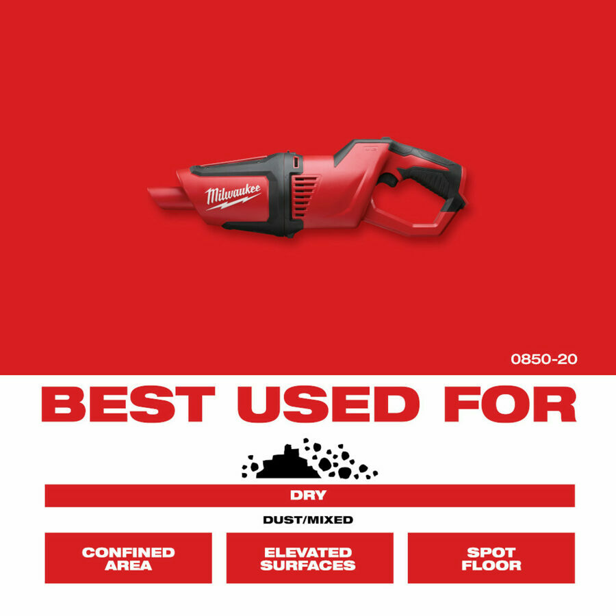 Description: The M12™ Compact Vacuum provides more power to clean anywhere. A high performance motor delivers maximum suction for a wide range of construction materials, such as wood chips and metal shavings. With up to 29 minutes of run-time on a single charge*, the M12™ Compact Vacuum can be used for spot clean-up or large area vacuuming. Additionally, the 0850-20 comes with a utility nozzle, crevice tool and extension wand for maximum application versatility. Built to withstand job site conditions, this portable vacuum is backed by a 5-year warranty. *29 minutes with REDLITHIUM™ XC4.0