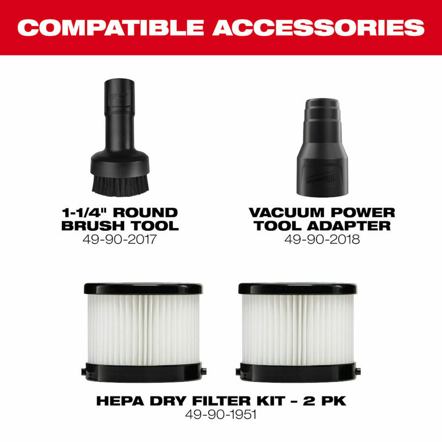 Details: Includes (1) M18 FUEL™ Compact Vacuum (0940-20) (1) Extension Wand (1) Powered Floor Tool (1) Floor Tool (1) 6' Flexible Hose (1) Crevice Tool (1) Utility Tool (1) Brush Tool (1) Accessory Holder (1) M18 FUEL Compact Vacuum Filter (49-90-2012) (1) Foam Pre-Filter