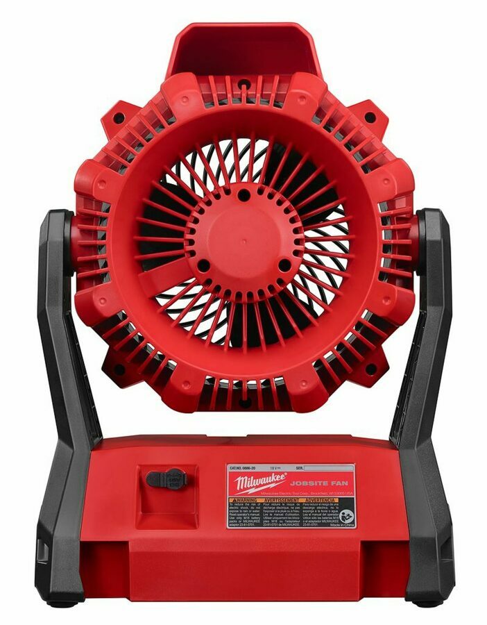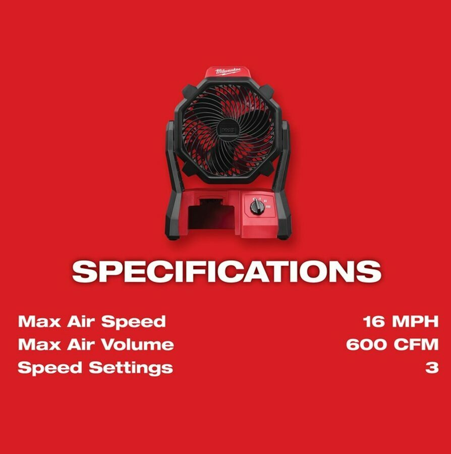 Description: The M18™ Jobsite Fan provides the most powerful airflow, and unmatched run-time in a compact size. The 0886-20 can circulate air over 40 feet, making it ideal for drying or cooling on a variety of jobsites. Powered by the M18™ REDLITHIUM™ battery the Jobsite Fan delivers up to 17 hours of run-time on low* for all day run-time on a single battery charge. This jobsite fan features a 120° adjustable head, 9 stopping positions and 3 speed settings which provide optimal airflow control. The 0886-20 also includes an AC adaptor for extended run-time. *17 hours with a M18 REDLITHIUM XC 5.0 battery (batteries and charger sold separately)