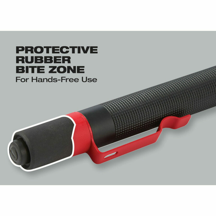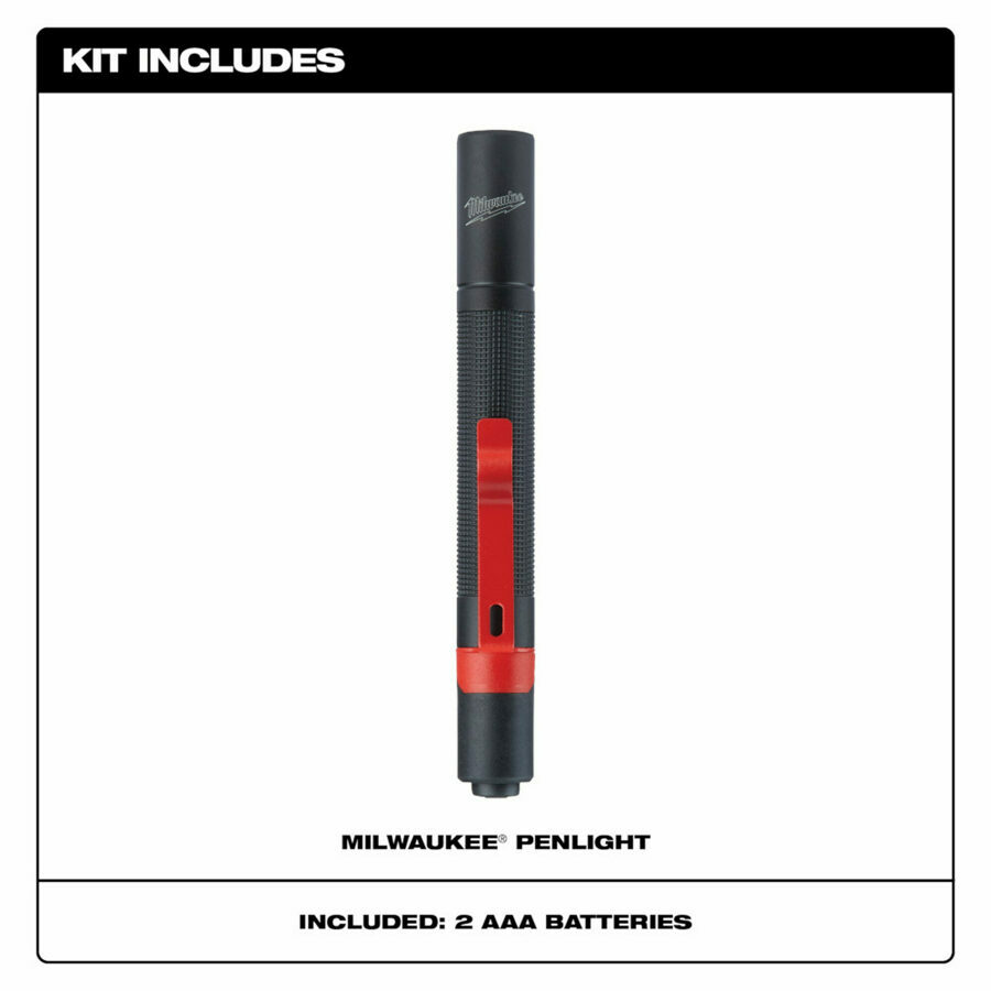 Description: Our Penlight delivers 100 lumens of output for Brighter, Clearer, Easier Inspections. The innovative protective rubber bite zone at the end of the light allows you to safely direct light while performing two-handed tasks. Our LED pen light is IP67 rated, making it waterproof, dustproof, and sealed to withstand the toughest job site conditions. The penlight's lens and 6000 series aircraft aluminum body are impact and corrosion resistant. The penlight’s metal clip easily attaches to your chest or pant pockets for quick access and everyday use. Our TRUEVIEW™ High Definition output illuminates more of your work area with brighter natural light optimized for high color accuracy. Our MILWAUKEE® Penlight is covered by a limited lifetime warranty.
