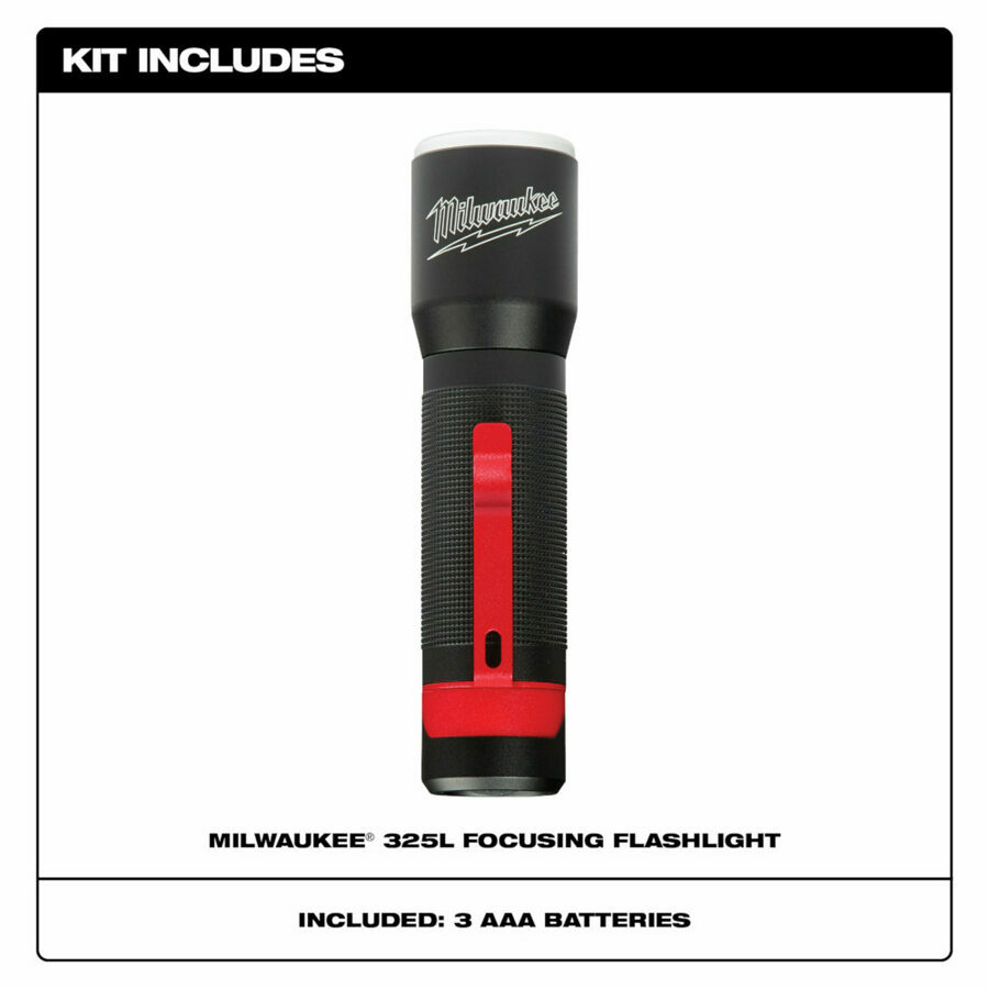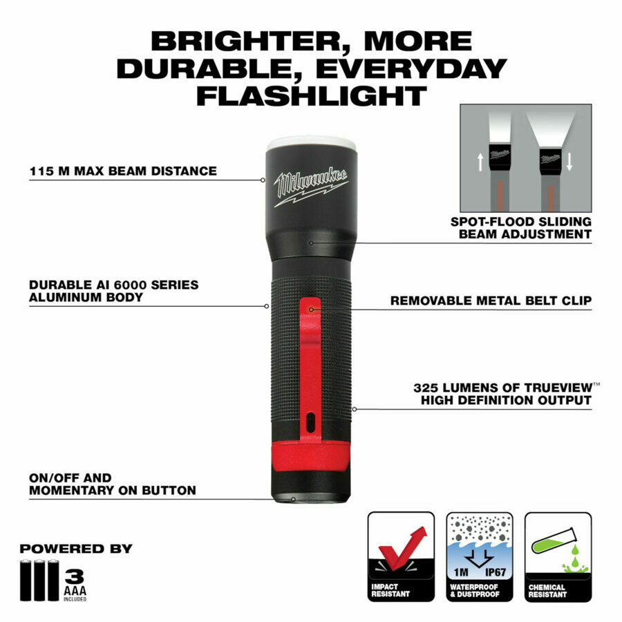 Description: Our 325L Focusing Flashlight delivers higher light output and is a Brighter, More Durable Everyday Flashlight. The compact flashlight is waterproof, dustproof, chemical resistant and survives repeated drops from 4 meters (12 ft.) to meet the daily demands of any jobsite. The LED light emits 325 lumens of TRUEVIEW™ High Definition Output and features a spot-to-flood sliding beam focus to give you up to 115 meters (377 feet) of beam distance for maximum visibility. Using the high and low output modes, you can optimize brightness or runtime depending on the job for up to 18 hours of runtime. The multi-beam flashlight's removable metal clip attaches to your chest or pant pocket for quick storage and access. Our 325 Lumen Focusing Flashlight's LEDs are covered by our limited lifetime warranty.
