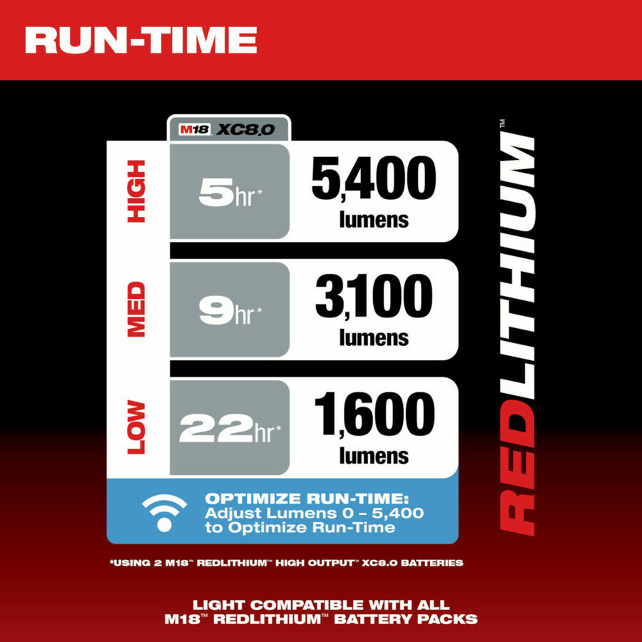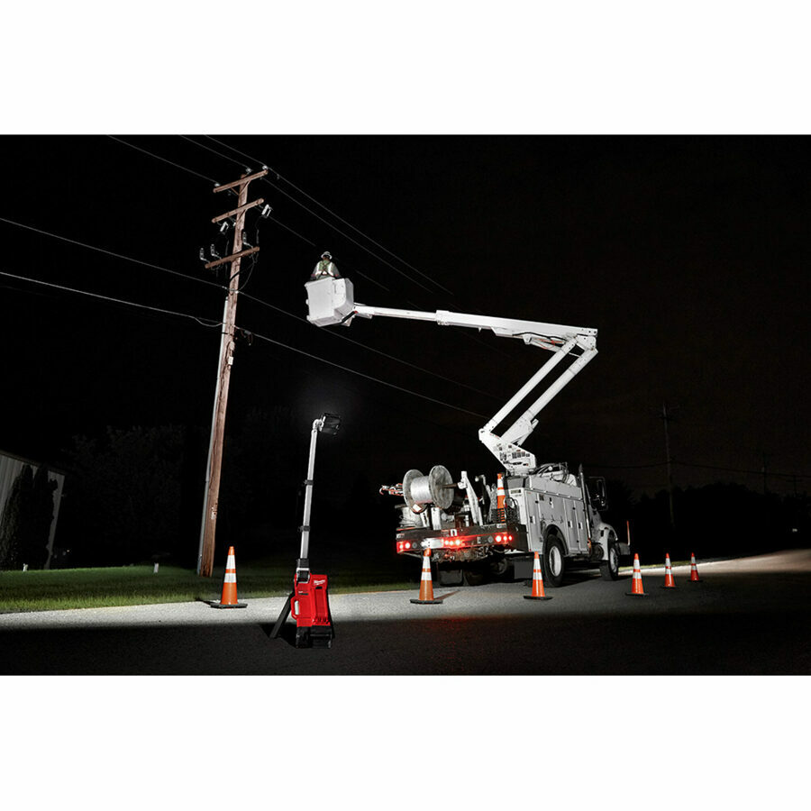 Description: Our M18™ ROCKET™ Dual Pack Tower Light w/ONE-KEY™ can get light to any environment on any terrain with its three leg position options paired with unmatched performance and all day run-time. Whether you need quick deployment or maximum stability, our light has a 7 second setup and 5'5 deployment height. Our tower light provides maximum portability with its 22” length stowed size, making it perfect for carrying long distances to a scene. The rotating light head offers 5400 lumens of TRUEVIEW™ High Definition Output and can run up to 26 hours with its dual battery design giving you the ability to use one or two M18™ batteries. It can withstand the harshest environments with its sealed battery compartment, making it waterproof and dustproof. The Dual Pack Tower Light is ONE-KEY™ capable allowing you to track and set run-times for unmatched customization. Its high quality LEDs never need to be replaced and are backed by a limited lifetime warranty. MILWAUKEE® ROCKET™ Tower Lights are designed to deploy in seconds and built to adapt to any job site environment. The LED light towers supply both task and area lighting as well as provide light overhead to reduce shadows in the workspace.