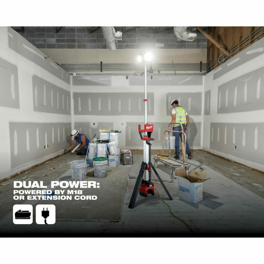 Description: Our M18™ ROCKET™ Tower Light/Charger is designed to deliver you a lighting solution that adapts, performs, and survives to the jobsite This light tower sets up in seconds to a max height of 7’ and collapses to less than 4’ for easy transportation and storage. The LED light head can be extended from 4-7’ to light overhead work or minimize shadows when casting shine downward. The multidirectional light head allows you to orient the three independently pivoting light heads to cast light in several directions. With an integrated AC plug , you can plug in the light with a standard extension cord and charge any M18™ REDLITHIUM™ pack or use the USB port to charge your devices on site. Delivering 6,000 lumens, it fills up large areas with TRUEVIEW™ High Definition light. For optimized control over the output and run-time, the M18™ ROCKET™ LED Light has three output settings. The LEDs never need to be replaced and are backed by a limited lifetime warranty.