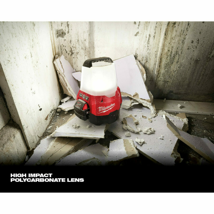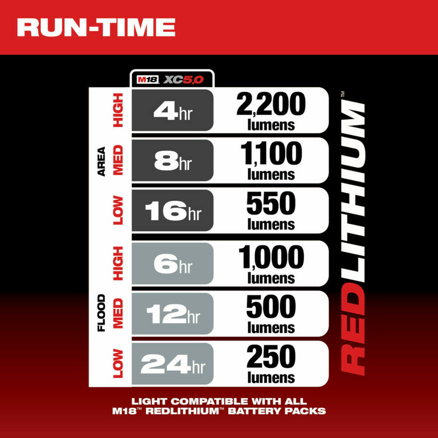 Description: Our M18™ RADIUS™ Compact Site Light with Flood Mode provides a two-in-one solution for area and task lighting with less to carry. The compact LED light delivers 2,200 lumens in area mode and 1,000 lumens in flood mode. Our light offers up to 16 hours of run-time with our M18™ XC 5.0 battery with the option to be plugged in using the AC inlet for extended run-time. Its compact size allows you to take this site light on and off the jobsite effortlessly and its 4-1/4" metal hanging hook allows you to easily hang the light overhead. The durable light is equipped with a high impact polycarbonate lens to withstand harsh jobsite abuse. Our high-quality LEDs never need to be replaced and are backed by a limited lifetime warranty. MILWAUKEE® RADIUS™ Site Lights provide maximum coverage for task, area, or overhead applications with their ability to fill an entire workspace with 360 degrees of light.
