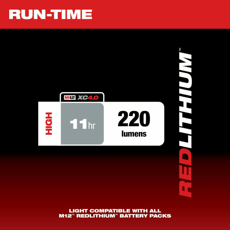 Description: Our M12™ Stick Light delivers 220 lumens of TRUEVIEW™ High Definition Output and unmatched versatility in a compact size for the best combination of brightness and coverage. Our light illuminates your work area with three powerful LEDs for brighter, optimized light. You can use the integrated multi-position hook to hang the light for hands-free use. The MILWAUKEE® Stick Light features a replaceable impact-resistant lens that is engineered to stand up to the toughest job site conditions. The M12™ Stick Light is compatible with all of our M12™ REDLITHIUM™ batteries (sold separately). Our stick lights are backed by a Limited Lifetime LED Warranty, the LEDs never need to be replaced.