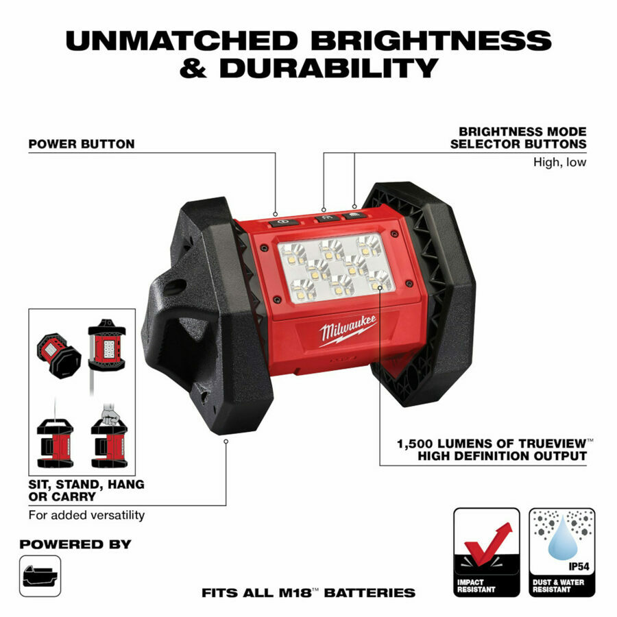 Description: Our M18™ ROVER™ Flood Light delivers up to 30% brighter light output than 250-watt halogen floodlights. The LED floodlight illuminates large workspaces with 8 high-quality LEDs that provide 1,500 lumens of TRUEVIEW™ High Definition Output. This floodlight delivers up to 10 hours of run-time on a single charge using an M18™ REDLITHIUM™ XC5.0 battery. The cordless floodlight has an innovative roll cage design and a replaceable impact-resistant lens, that stands up to the toughest working conditions. This compact floodlight features an octagonal shape so it can be positioned and used at multiple angles, and the versatile design delivers hands-free options for a variety of applications. This floodlight has a limited lifetime LED warranty, LEDs never need to be replaced. MILWAUKEE® ROVER™ Flood Lights are built to go anywhere and withstand anything.