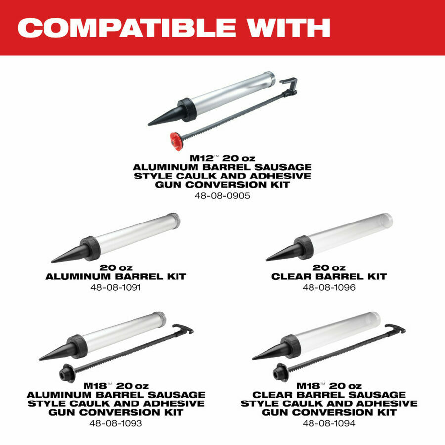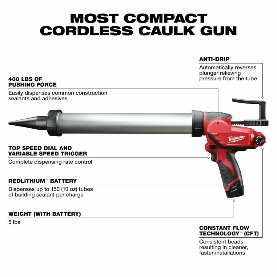 Description: The M12 Caulk and Adhesive Gun is the lightest, most compact cordless powered caulk gun on the market today. With up to 400 lbs. of pushing force the M12 Caulk Gun easily dispenses everyday construction sealants and adhesives. The combination Variable Speed Trigger and Max-Speed dial allow for total application speed control. The 360 degree Rotating Collar delivers maximum control around turns. The tool also features auto-reversing anti-drip, a seal puncture tool and durable hang hook for versatility on the job. Powered by the revolutionary M12 REDLITHIUM Battery, the M12 Caulk Gun will dispense up to 150 10oz. tubes of building sealant on one charge.This configuration is designed to work with 20oz. sausage pack style material containers. Milwaukee also offers accessory conversion kits to change to 10oz. cartridges (48-08-0900) and Quart cartridges (48-08-0910).