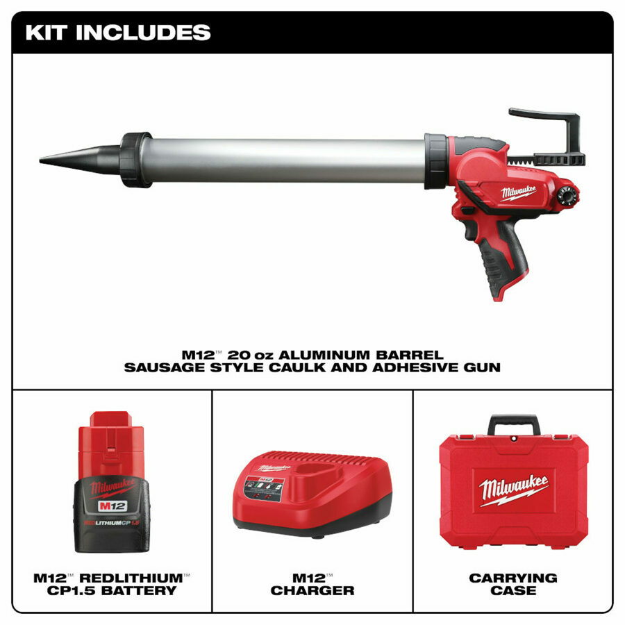 Details: Includes (1) 12V 20 oz Aluminum Barrel Sausage Conversion Kit (48-08-0905) (1) M12™ Lithium-ion Battery Charger (48-59-2401) (1) M12™ REDLITHIUM™ CP1.5 Battery Pack (48-11-2401)