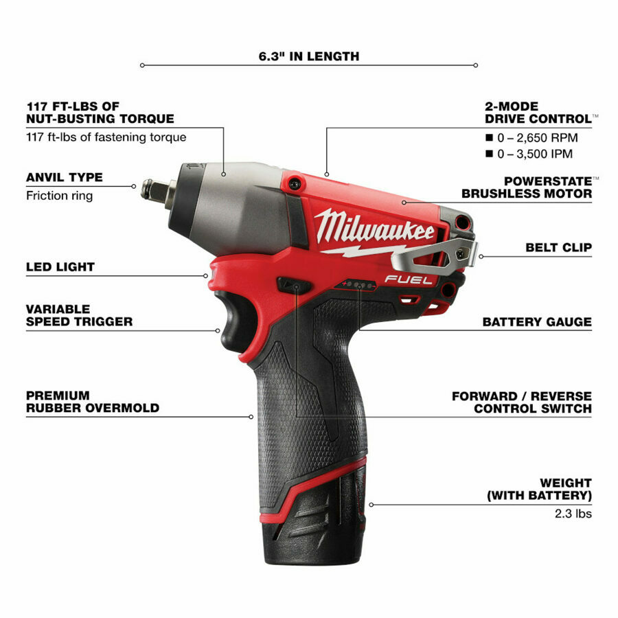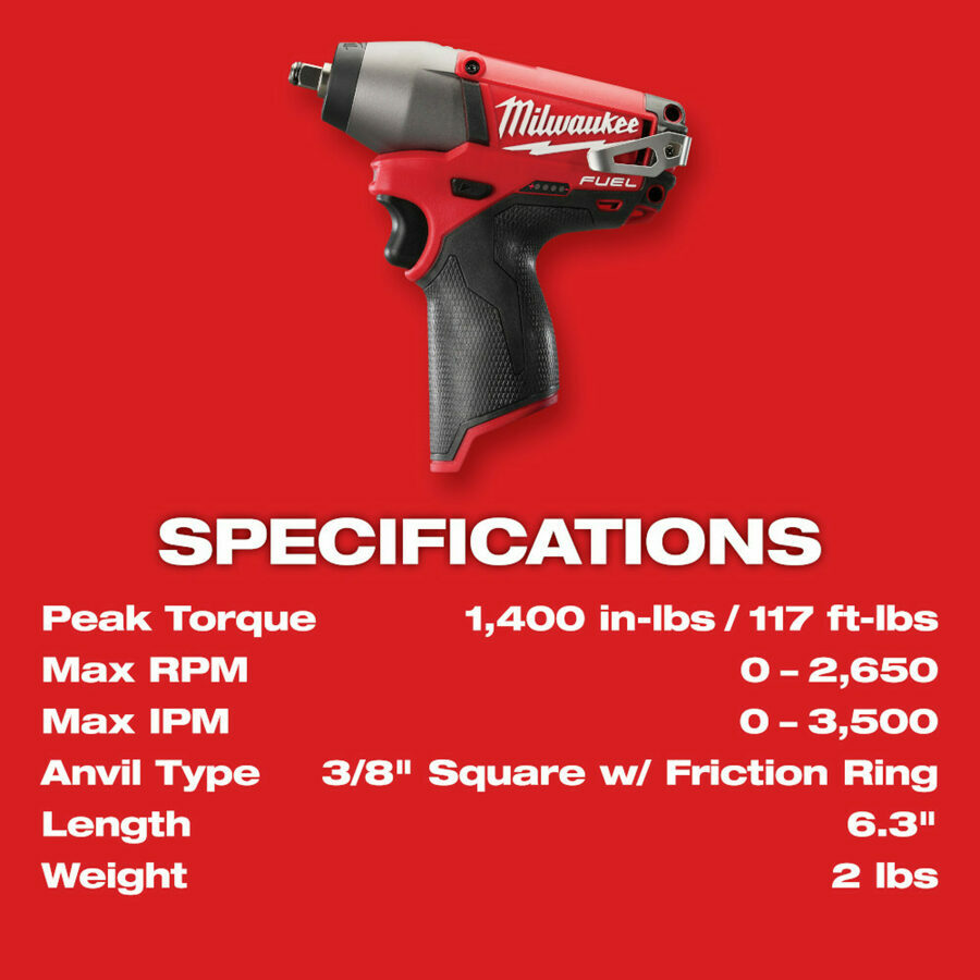 Description: The M12 FUEL™ 3/8" Impact Wrench optimizes torque in tight spaces. This lightweight yet powerful impact wrench offers up to 3X longer motor life, up to 2X more runtime, and proprietary Milwaukee® 2-Mode DRIVE CONTROL™ for better control over the power and speed required for specific applications. The POWERSTATE™ Brushless Motor outperforms all leading competitors with constant power output, yet runs cooler with no wearable components. The REDLITHIUM™ 2.0 Compact Battery Pack delivers up to 20% more power and 2X more recharges than standard lithium-ion batteries, as well as best-in-class performance in extreme jobsite conditions. The onboard fuel gauge helps you monitor the charge more accurately, so there’s less downtime on the job. REDLINK PLUS™ intelligence ensures optimized performance and protection from overload, overheating and over-discharge. The M12 FUEL 3/8" Impact Wrench provides up to 1,400 in-lbs of torque. Its compact size and weight drive more control and less user exertion. The built-in LED light illuminates work surfaces in dark locations.