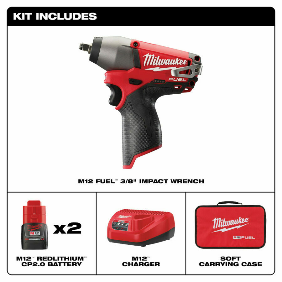 Details: Includes (1) M12 FUEL™ 3/8" Impact Wrench (Tool Only) (2454-20) (2) M12™ REDLITHIUM™ CP2.0 Battery (48-11-2420) (1) M12™ Lithium-ion Battery Charger (48-59-2401)