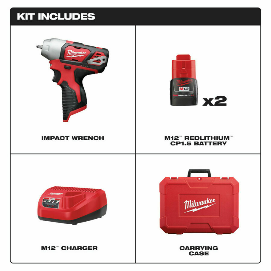 Details: Includes (1) M12™ ¼” Impact Wrench (Tool Only) (2461-20) (1) M12™ Lithium-ion Battery Charger (48-59-2401) (2) M12™ REDLITHIUM™ CP1.5 Battery Pack (48-11-2401) (1) Carrying Case (1) Belt Clip