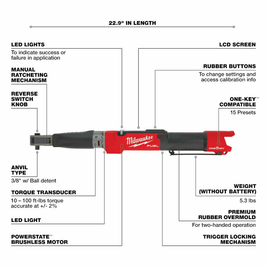 Description: M12 FUEL™ ⅜” Digital Torque Wrench w/ ONE-KEY™ is the industry's first torque wrench with a motor, delivering increased productivity, precise torque accuracy, and user demanded reporting functionality. The ⅜” torque wrench delivers 50% faster installation time, replacing the hand tool or two tool installation process and providing more control to reduce the over torquing of fasteners. The ⅜” digital torque wrench provides 10-100ft-lbs of torque range and accuracy within 2% for torque critical fasteners. This battery powered torque wrench is equipped with Milwaukee ONE-KEY™ giving you the power to track, report, and manage your tool. This tool will record all of the fasteners that are saved and produce a downloadable report via ONE-KEY™ for the necessary parties requiring the data. ONE-KEY™ allows you to wirelessly connect to a smartphone to customize the tool settings, track its location, manage inventory, and lock the tool out for added security and protection for your investment.