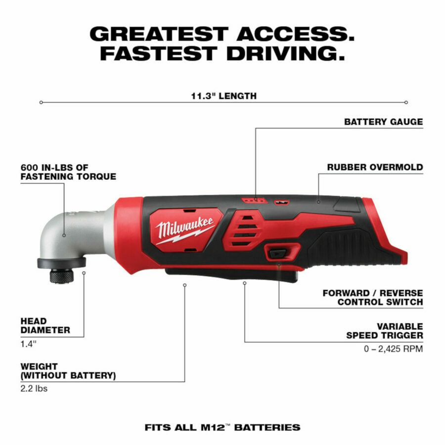 Description: The M12™ ¼” Hex Right Angle Impact Driver is the ultimate solution for jobs demanding extreme power and speed in the tightest spaces. With a 1.4” head diameter, and the ability to use with most 1” insert bits, the M12™ ¼” Hex Right Angle Impact Driver offers users maximum access for hard-to-reach fasteners. The tool provides the most power and highest RPM in its class, and is optimized to run at full speed throughout the toughest applications. Variable speed with an extended paddle switch provides tradesmen complete control, and the ability to operate their tool from multiple grip positions. Get maximum life out of the M12™ ¼” Hex Right Angle Impact Driver. Powered by REDLITHIUM™ Battery Pack which delivers more work per charge and more work over pack life than the competitors. REDLINK™ Intelligence provides optimized performance and overload protection against abusive situations.
