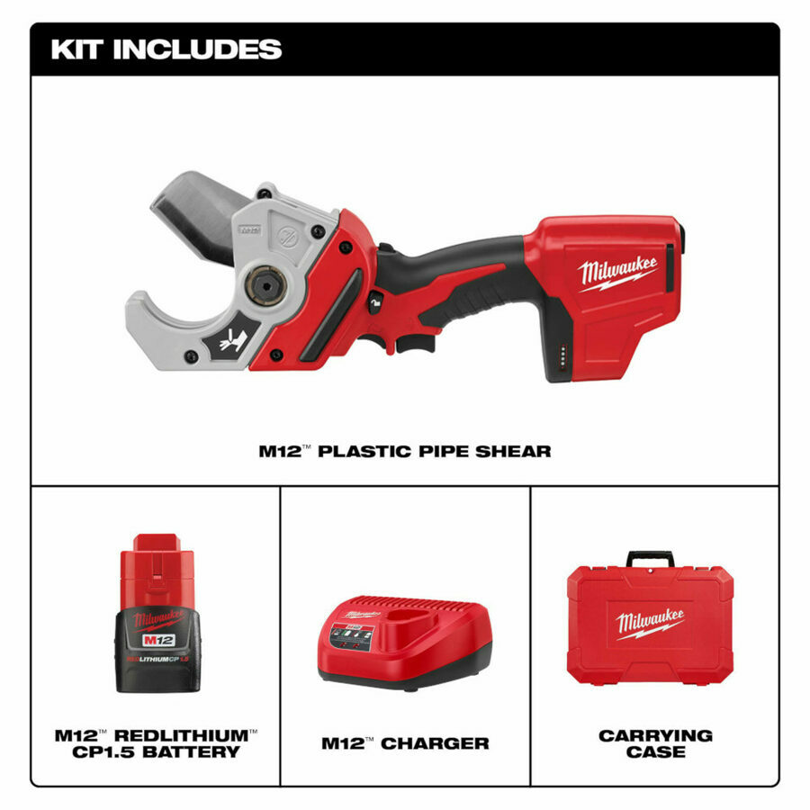 Details: Includes (1) M12™ Plastic Pipe Shear (Tool Only) (2470-20) (1) M12™ Lithium-ion Battery Charger (48-59-2401) (1) M12™ REDLITHIUM™ CP1.5 Battery Pack (48-11-2401) (1) Carrying Case