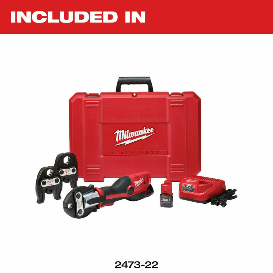 Details: Includes (1) M12™ FORCE LOGIC™ Press Tool (2473-20) (1) 3/4" CTS-V Press Jaw for M12™ FORCELOGIC™ Press Tool (49-16-2451) (1) 1/2" CTS-V Press Jaw for M12™ FORCELOGIC™ Press Tool (49-16-2450) (1) 1" CTS-V Press Jaw for M12™ FORCELOGIC™ Press Tool (49-16-2452) (1) M12™ Lithium-ion Battery Charger (48-59-2401) (2) M12™ REDLITHIUM™ CP1.5 Battery Pack (48-11-2401) (1) Hard Carrying Case