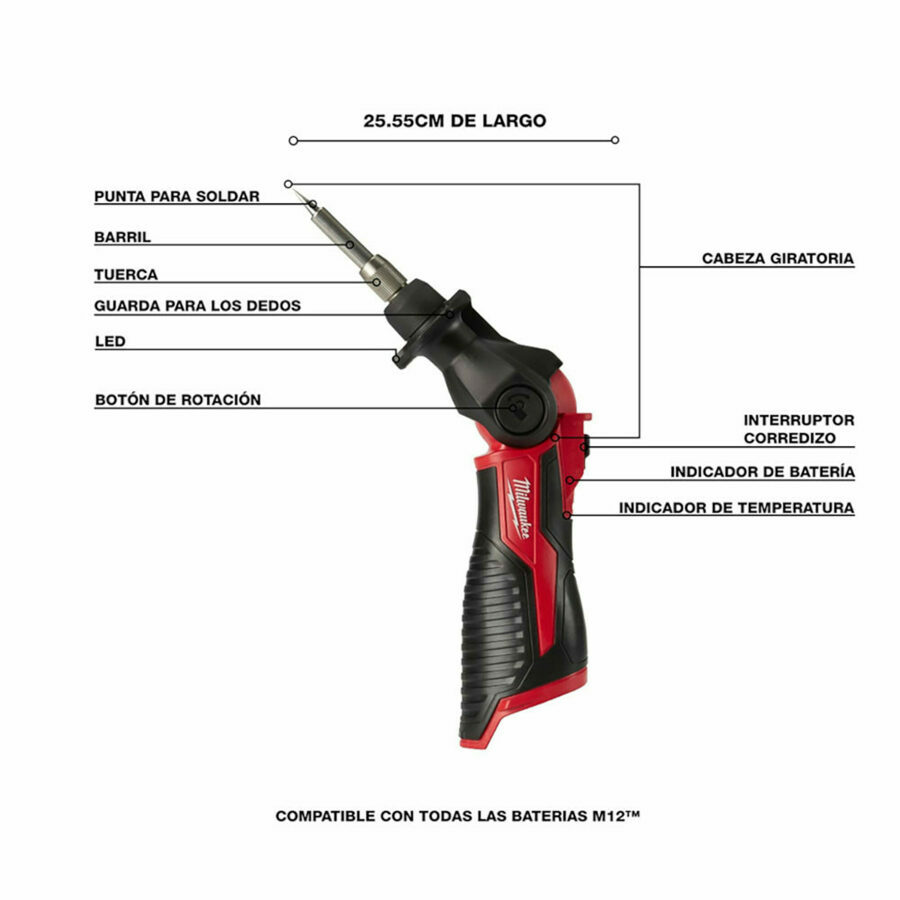 Description: The M12™ Soldering Iron delivers fast application speeds by reaching operational temperature in under 18 seconds and maintaining an optimized temperature throughout the most demanding applications. The heat indicator utilizes REDLINK™ INTELLEGENCE to notify users when the tool is ready-to-use and safe-to-store, eliminating the guesswork. The 3-stop pivoting head provides unmatched access by allowing users the ability to adapt the tool for the application and solder in more confined spaces. The M12™ Soldering Iron powered by REDLITHIUM™ battery technology delivers up to 40 minutes of run-time on a M12™ Compact Battery Pack.