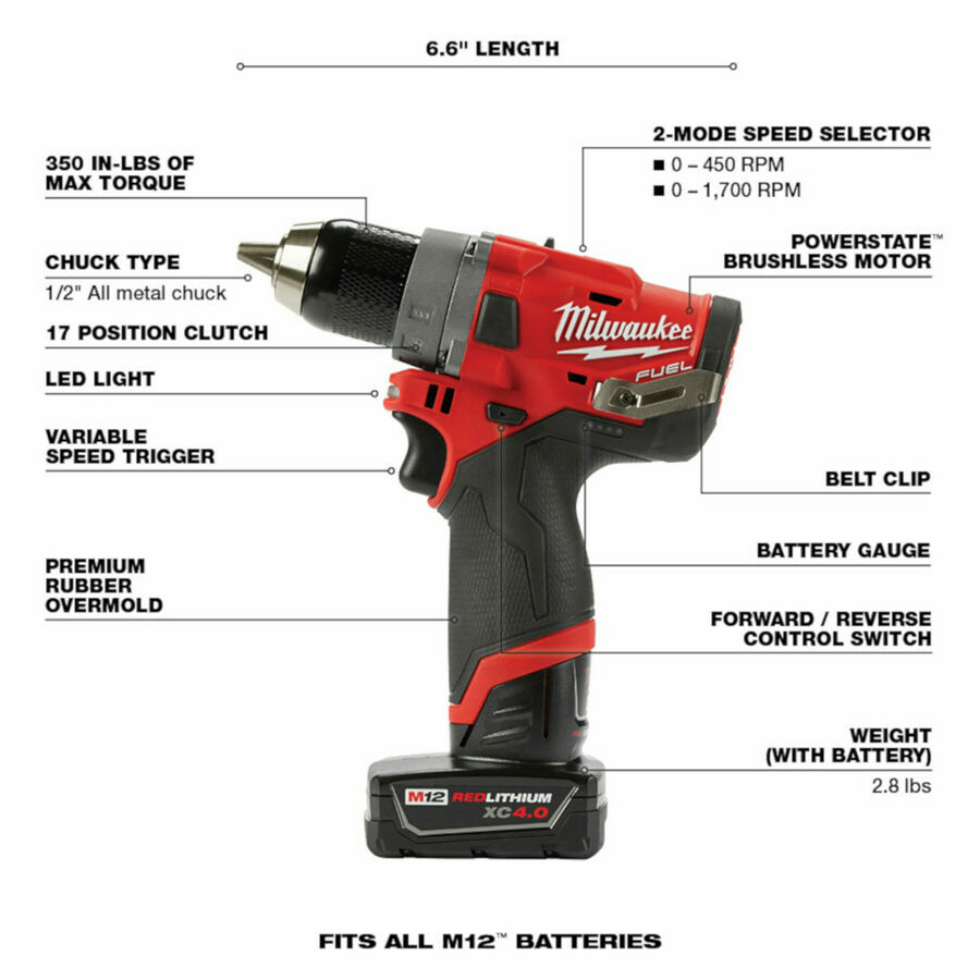 Details: Includes (1) M12 FUEL™ 1/2" Drill Driver (Tool Only) (2503-20) (1) M12™ REDLITHIUM Compact Battery Pack (1) M12™ REDLITHIUM™ XC 4.0 Extended Capacity Battery Pack (1) Charger (1) Belt Clip (1) Carrying Case