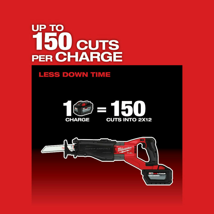 Description: The SUPER SAWZALL® Reciprocating Saw generates 15A corded power, faster cuts than 15A reciprocating saws and delivers Up To 150 Cuts in 2x12 SPF per charge. Designed to perform in the toughest applications, the M18™ FUEL SUPER SAWZALL® combines Milwaukee's legendary performance and durability with the portability of the M18™ platform. The POWERSTATE™ Brushless Motor Provides 3,000 SPM and higher speeds under load for corded cutting performance. REDLINK PLUS™ intelligence ensures maximum performance and protection from overload, overheating and over discharge. The M18™ REDLITHIUM™ HIGH OUTPUT™ HD12.0 battery delivers unmatched run-time in all applications. The 1-1/4" stroke length removes more material with each stroke and On/Off orbital action provides aggressive cuts in wood and smooth cuts in metal. Variable speed trigger and 5-speed dial provide maximum speed control for any application. The QUIK-LOK® blade clamp allows for tool less blade changes and a rafter hook provides a convenient way to store the saw between cuts.
