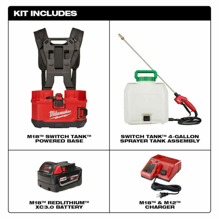 Our M18™ SWITCH TANK™ 4-Gallon Backpack Sprayer is part of the M18™ system which is fully compatible with over 175 tools. In addition to the backpack sprayer, the kit includes one M18™ REDLITHIUM™ XC3.0 Battery and an M18™/M12™ Multi-Voltage Charger.