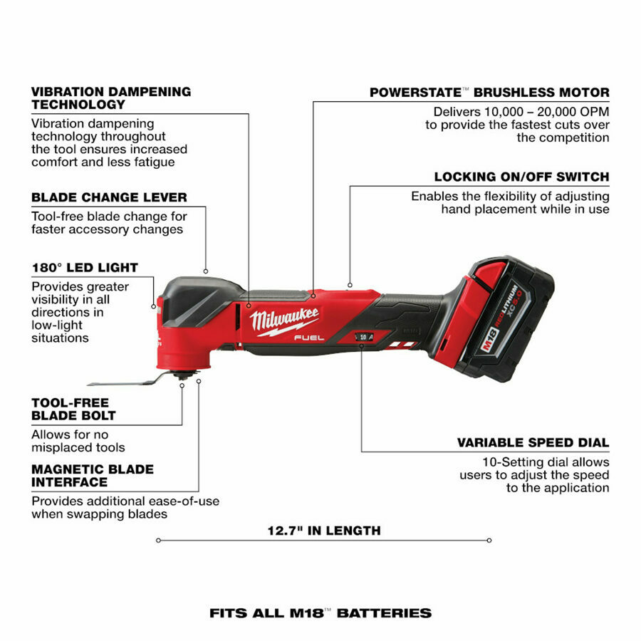 Description: M18 FUEL™ Oscillating Multi-Tool Kit generates the fastest cuts, the power for demolition, and the lowest full tool vibration. The POWERSTATE™ Brushless Motor delivers 10,000 to 20,000 OPM with an aggressive 4.2-degree oscillation angle to deliver the fastest cuts over the competition. The cordless multi-tool also gives you the power to complete many demanding applications with ease, such as large cuts through hardwoods and nail embedded wood, pushing the limits of what a multipurpose oscillating tool can do. Vibration dampening technology delivers the lowest full tool vibration, letting you make cuts more comfortably with less fatigue. REDLINK PLUS™ Intelligence ensures you achieve unmatched levels of performance, protection, and compatibility. The M18™ REDLITHIUM™ XC5.0 battery delivers more work per charge than competitive batteries on the market when used with the multitool. The MILWAUKEE® M18 FUEL™ Oscillating Multi-Tool has a 10-Setting Dial with an additional Auto-Load Feature, allowing you to adjust the speed to the application. An integrated 180-degree LED light provides maximum visibility in low-light situations.
