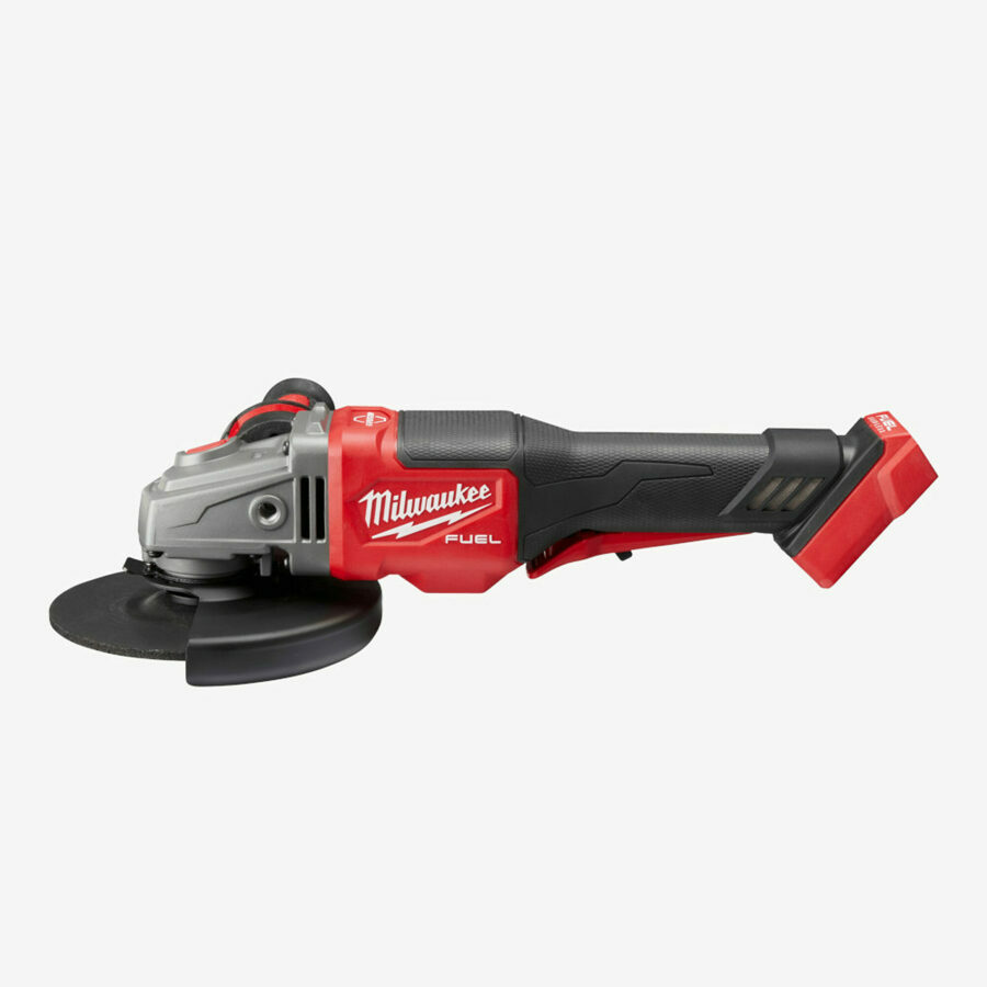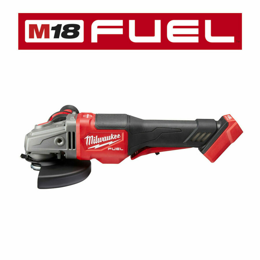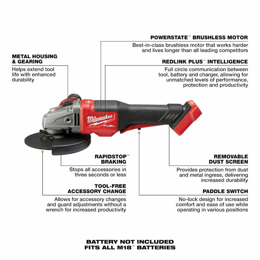 Description: Our M18 FUEL™ 4-1/2” - 6” Braking Grinder, Paddle Switch, No-Lock is our highest performing small angle grinder. It generates the power of a 13A corded grinder, brakes all accessories under 3 seconds, and has 6” grinding capacity. The POWERSTATE™ Brushless Motor provides you with 9,000 RPM and the power equivalent of a 13A corded grinder, delivering industry-leading performance. REDLINK PLUS™ Intelligence ensures maximum performance and protects your angle grinder from overload, overheating and over discharge. The RAPID STOP™ Brake feature stops all accessories in under 3 seconds. Providing you with high performance, advanced ergonomics and legendary durability, the M18 FUEL™ 4-1/2” - 6” Braking Grinder is designed to complete the toughest grinding, surface preparation and cutting applications with all 4-1/2” – 6” accessories. The M18™ REDLITHIUM™ HIGH OUTPUT™ XC6.0 Battery provides you with more material removed per charge and unmatched run-time in all applications. Tool-free accessory changes using the FIXTEC nut and tool-free guard adjustments mean you will experience less downtime as you work. The cordless angle grinder's grinding wheel is sold separately.