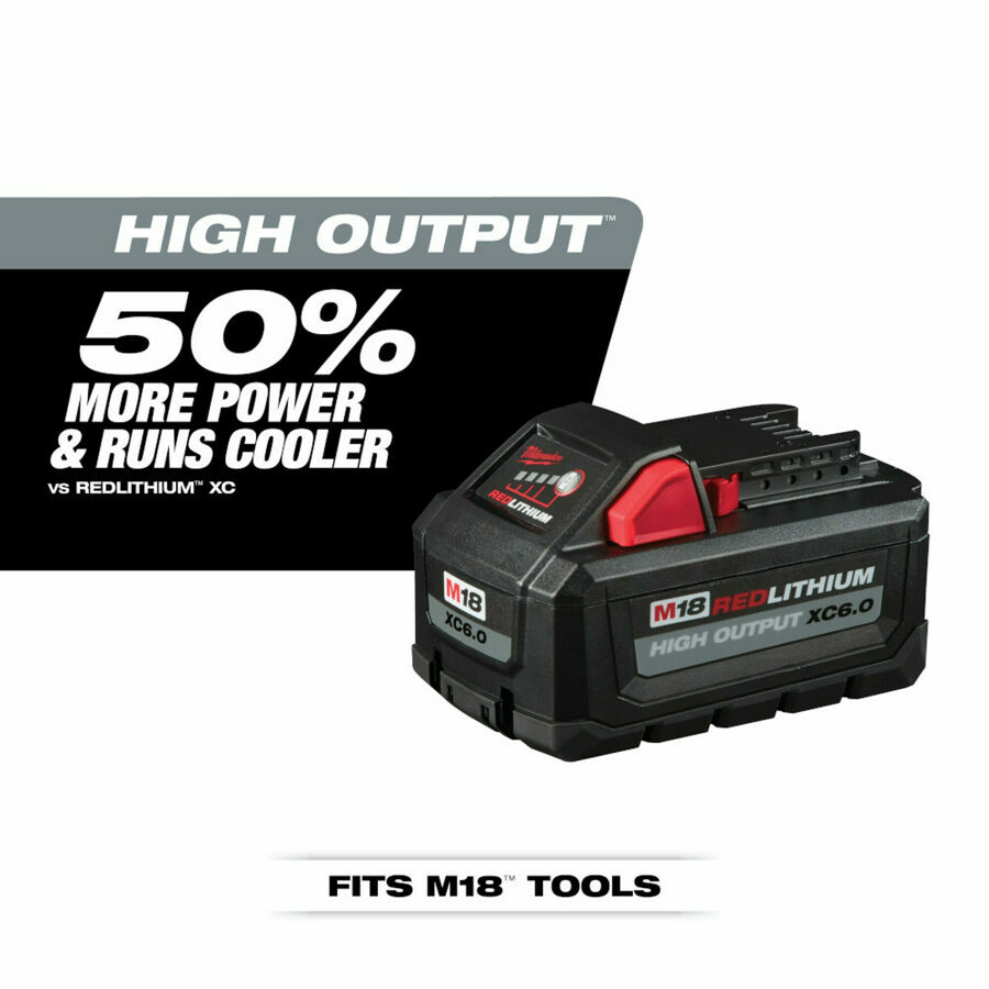 Description: The M18™ REDLITHIUM™ HIGH OUTPUT™ XC6.0 Battery Pack provides 50% more power and runs 50% cooler vs M18™ REDLITHIUM™ XC battery packs. The optimized combination of size and increased power provides a great solution for the entire range of M18™ products. It delivers fade free power and runs substantially cooler through heavy applications, allowing tradesmen to push their cordless tools harder and longer than ever before. The M18™ REDLITHIUM™ HIGH OUTPUT™ XC6.0 provides increased power in extreme cold weather conditions (below 0F / -18C) and delivers more work per charge, driving corded replacement on the jobsite. The REDLITHIUM™ HIGH OUTPUT™ XC6.0 battery is fully compatible with 150+ M18™ solutions.