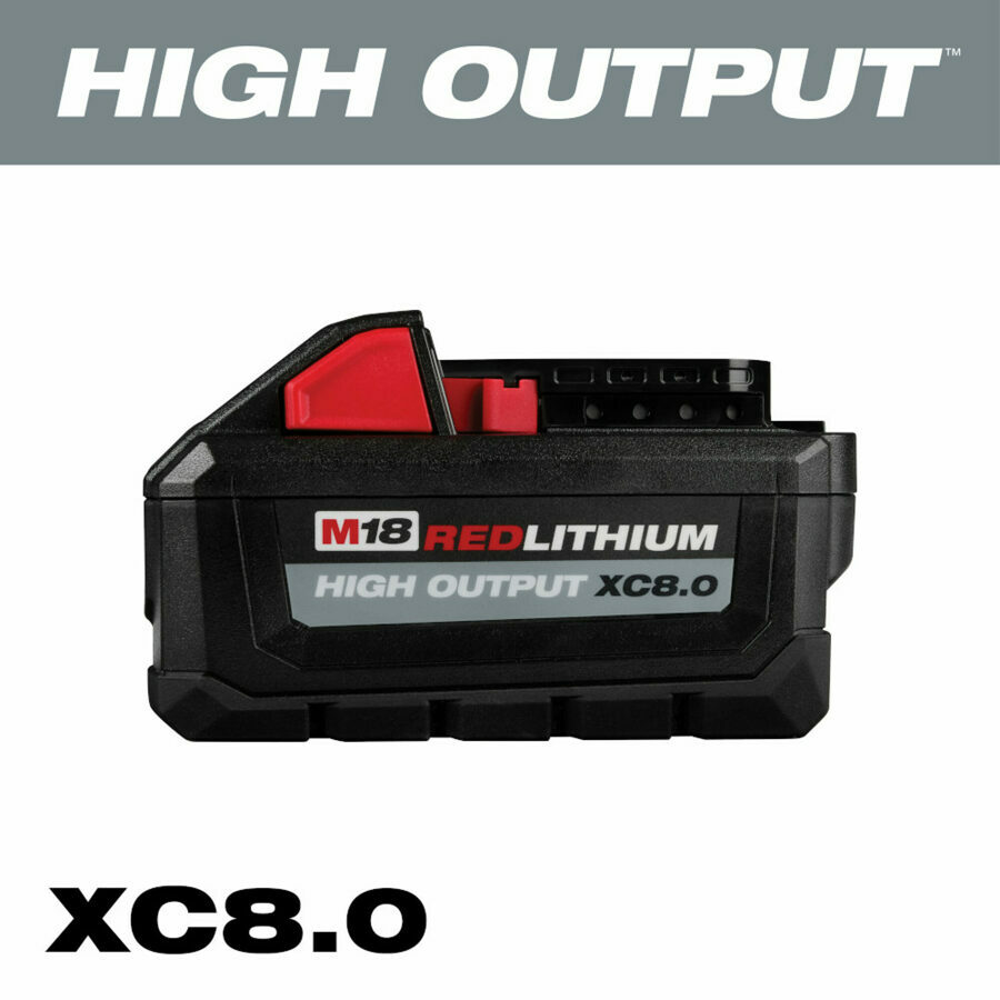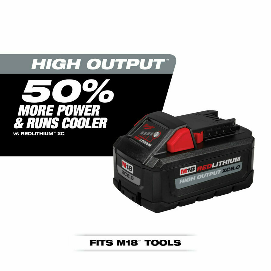Description: The M18™ REDLITHIUM™ HIGH OUTPUT™ XC8.0 Battery Pack provides 50% more power and runs 50% cooler vs M18™ REDLITHIUM™ XC battery packs. The optimized combination of smaller size and increased power of the 18-volt battery provides a great solution for the entire range of M18™ products. The lithium-ion battery delivers fade-free power and runs substantially cooler through heavy applications, allowing trade professionals to push their cordless tools throughout a wide application range. The M18™ XC8.0 battery provides increased power in extreme-cold weather conditions (below 0F / -18C) and delivers more work per charge, driving corded replacement. The REDLITHIUM™ HIGH OUTPUT™ XC8.0 extended capacity battery is fully compatible with all Milwaukee M18™ solutions.