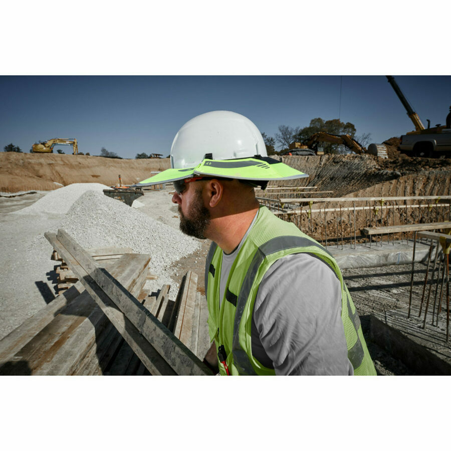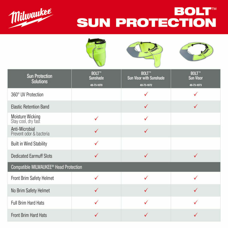 Description: Our BOLT™ Sun Visor provides 360° UV protection. Securely clip into any Milwaukee and most professional helmets or hard hats. The MILWAUKEE® Sun Visor is designed with a tinted brim to reduce glare without reducing your upward vision. The antimicrobial shade prevents odor and bacteria, while the mesh portion keeps you cool. The front visor can be used with face shield or eye protection when flipped back into retention slots allowing you to use multiple accessories simultaneously.