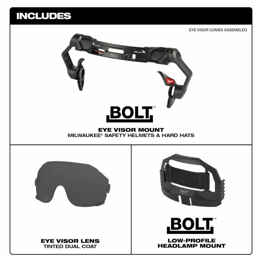 Description: Our BOLT™ Eye Visor is designed to provide you with the best fit and easy headlamp use. These Z87.1+ eye visors are classified as spectacles and can be used in place of safety glasses. The eye visor pivots and adjusts to provide a comfortable and secure fit for a wide variety of face shapes. The eye visor includes a BOLT™ Low-Profile Headlamp Mount that allows seamless compatibility with most headlamps. Each eye visor is treated with a fog-free interior coating and an anti-scratch exterior hard coating for longer product lifetimes. This eye visor is part of the BOLT™ Accessory System which allows our users to Secure Accessories Simultaneously.