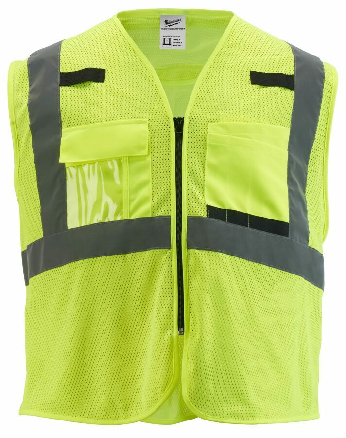 Description: Our ANSI Type R Class 2 High Visibility Mesh Safety Vests are designed to keep you cooler. This MILWAUKEE® safety vest features lightweight, breathable mesh, helping you stay cooler and comfortable in hot working conditions. The high visibility mesh safety vest has 9 pockets, including a clear ID holder and an internal pocket providing you with added storage. The vest features a durable pass-through slit for fall protection gear. The zipper closure on the safety vest provides you with ultimate job site security. Class 2 high visibility reflective vests are recommended when working in environments with traffic traveling under 50 mph or around heavy machinery. This includes construction, road construction, traffic direction, utility crews, and survey crews. Class 2 Breakaway Mesh Safety Vests with CSA options are also offered, featuring five tearaway points located on the shoulders, sides, and front of the vest that can breakaway if caught or snagged. Yellow and orange safety vests are available. These safety vests are customizable by adding your logo.