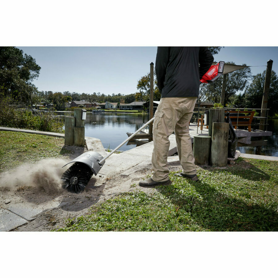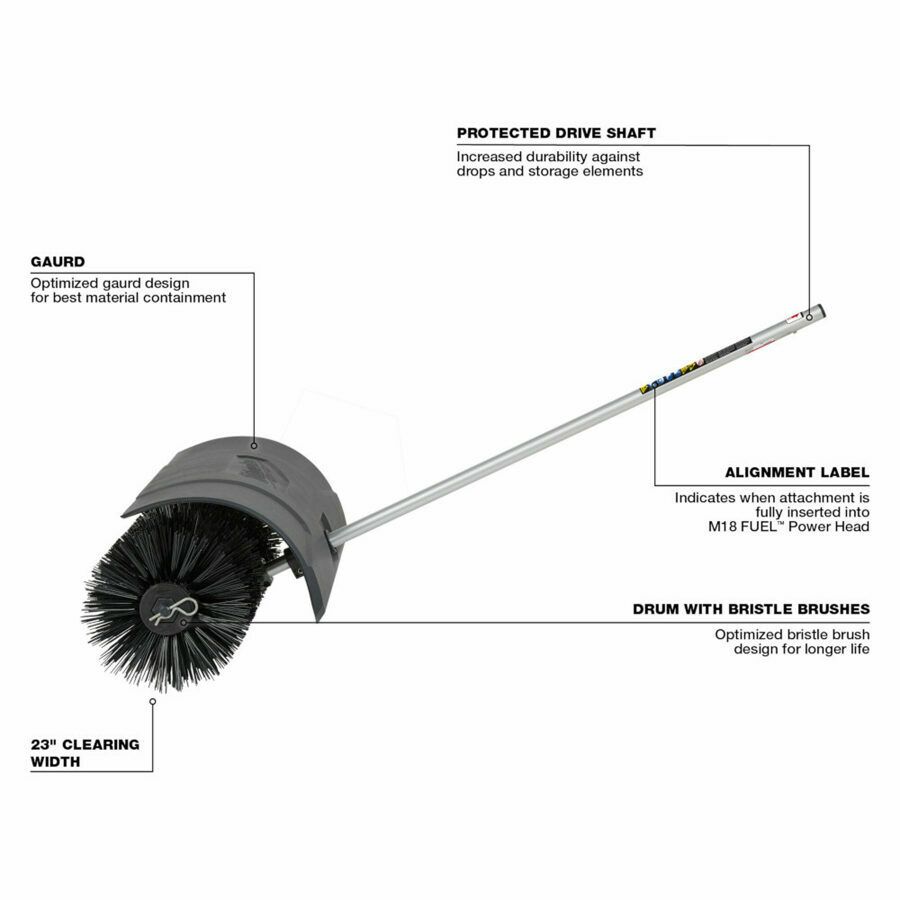 Description: Our M18 FUEL™ QUIK-LOK™ Bristle Brush Attachment is powered by the M18 FUEL™ Power Head w/ QUIK-LOK™ and is compatible with our split boom M18 FUEL™ QUIK-LOK™ Attachment System. This split shaft attachment's optimized bristle design is great for removing debris like mulch and dirt from hard surfaces and allows for longer life while covering a 23" clearing width. Our bristle brush's optimized guard design offers the best material containment. Our QUIK-LOK™ Attachments feature protected drive shafts for increased durability against drops and storage elements. The bristle brush attachment also features optimized gearing to manage the cordless M18 FUEL™ Power Head RPM output specifically for this attachment.