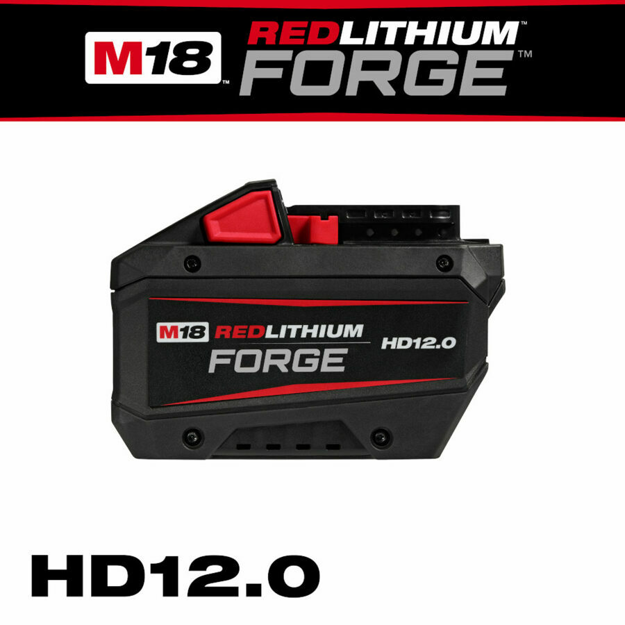 Description: The M18™ REDLITHIUM™ FORGE™ HD12.0 Battery Pack delivers 50% more power than the HIGH OUTPUT™ 12.0, high-speed cooling for less downtime in high-demand applications, 35-minute supercharge to 80%, and the longest life vs REDLITHIUM™ batteries. REDLITHIUM™ FORGE™ are Milwaukee's most powerful, fastest charging, and longest life batteries. The M18™ REDLITHIUM™ FORGE™ HD12.0 is COOL-CYCLE™ capable. COOL-CYCLE™ Active Cooling System provides high-speed cooling for less downtime. Patented ingress coating provides increased protection to maximize active cooling through an upgraded venting design. The high-speed cooling feature works with M18™ chargers that have COOL-CYCLE™ capability. When paired with the M18™ Dual Bay Simultaneous Super Charger, this battery charges in just 35 minutes to 80%, getting you back to work faster than ever before. This lithium-ion battery has the longest life, the most recharges, and the best performance over the life of the battery. It is also designed with resistant housing for increased protection against exposure to common oils, greases, and solvents. Built-in REDLINK™ Intelligence protects the battery from overloads, preventing you from damaging your cordless power tools in heavy-duty situations. The REDLITHIUM™ FORGE™ HD12.0 battery is fully compatible with 250+ M18™ solutions.