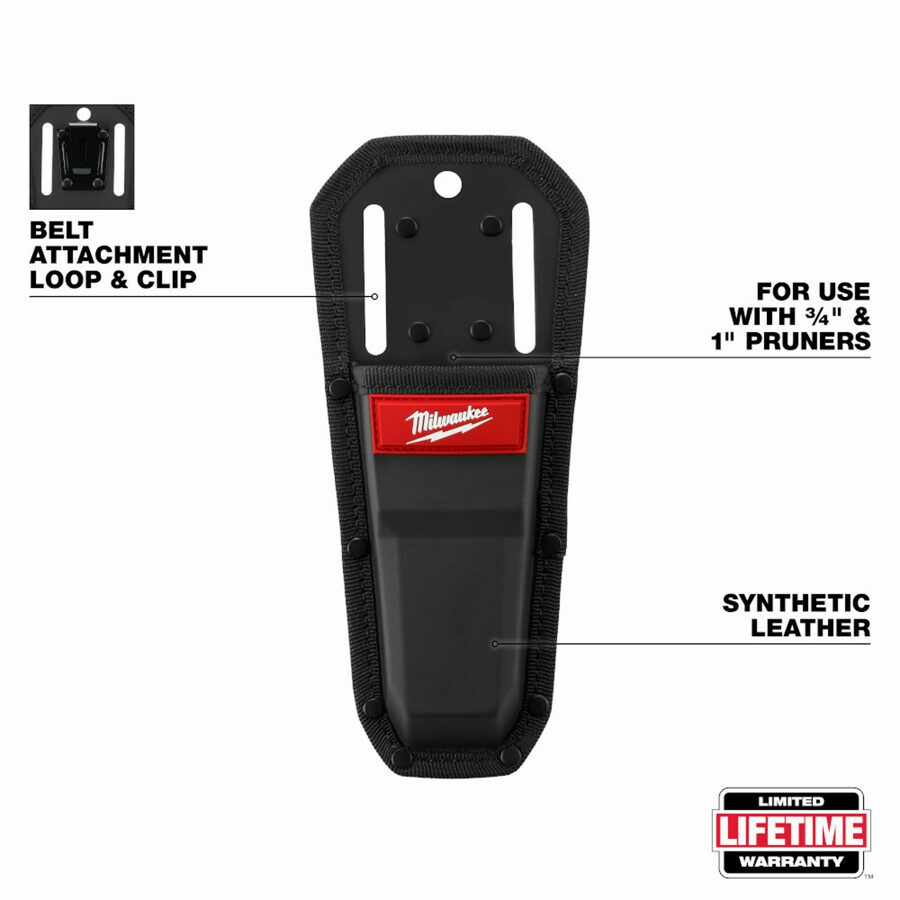 Description: Pruner Sheath is designed to securely hold 3/4" and 1" Pruners. The Sheath can be securely attached with the belt attachment loop or clip. The synthetic leather withstands jobsite conditions. The Pruner Sheath is covered by a limited lifetime warranty.