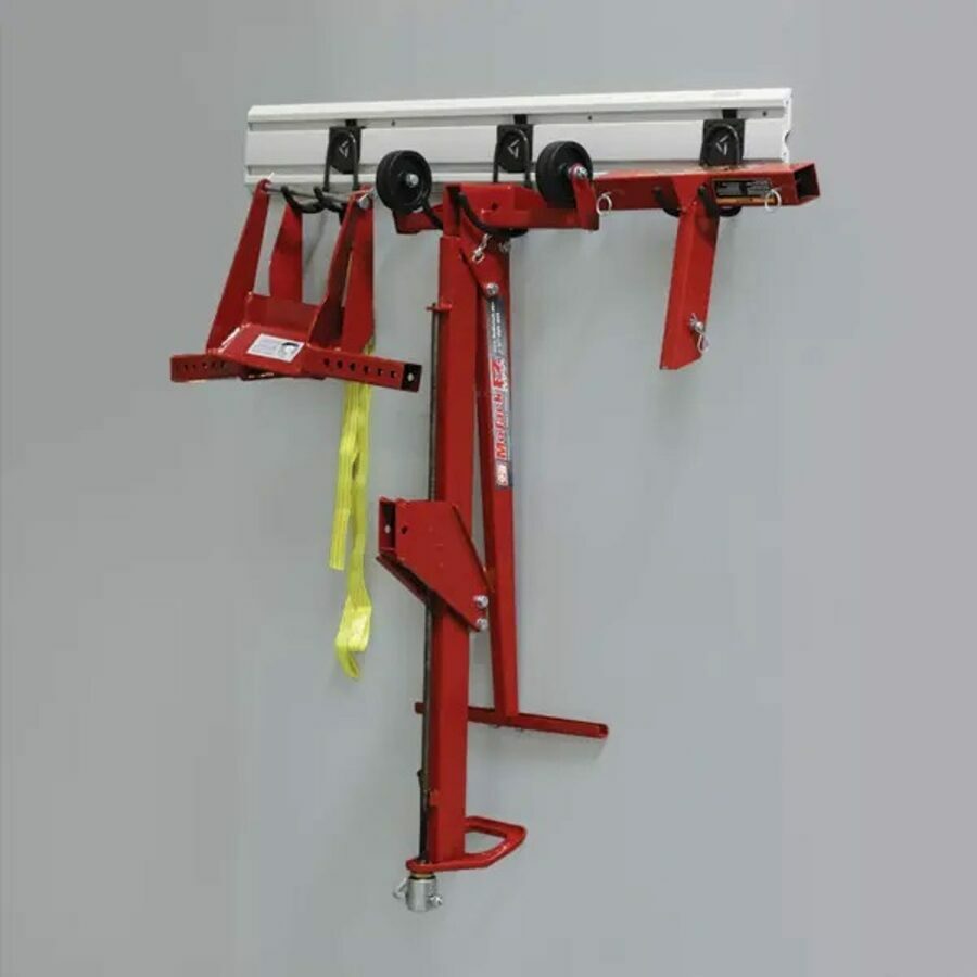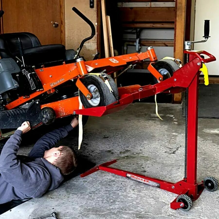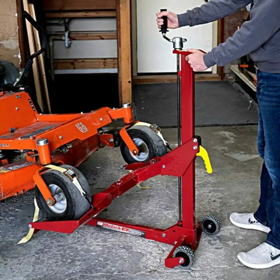 Description: The MoJack EZ MAX mower lift features a unique clutch system for easy lifting and automatic safety system with smooth release handle. The clutch system provides the right amount of torque when lifting light or heavy-duty lawn mower or tractor. The MoJack EZ MAX Mower Lift can be raised with a drill and can be folded flat for storage.