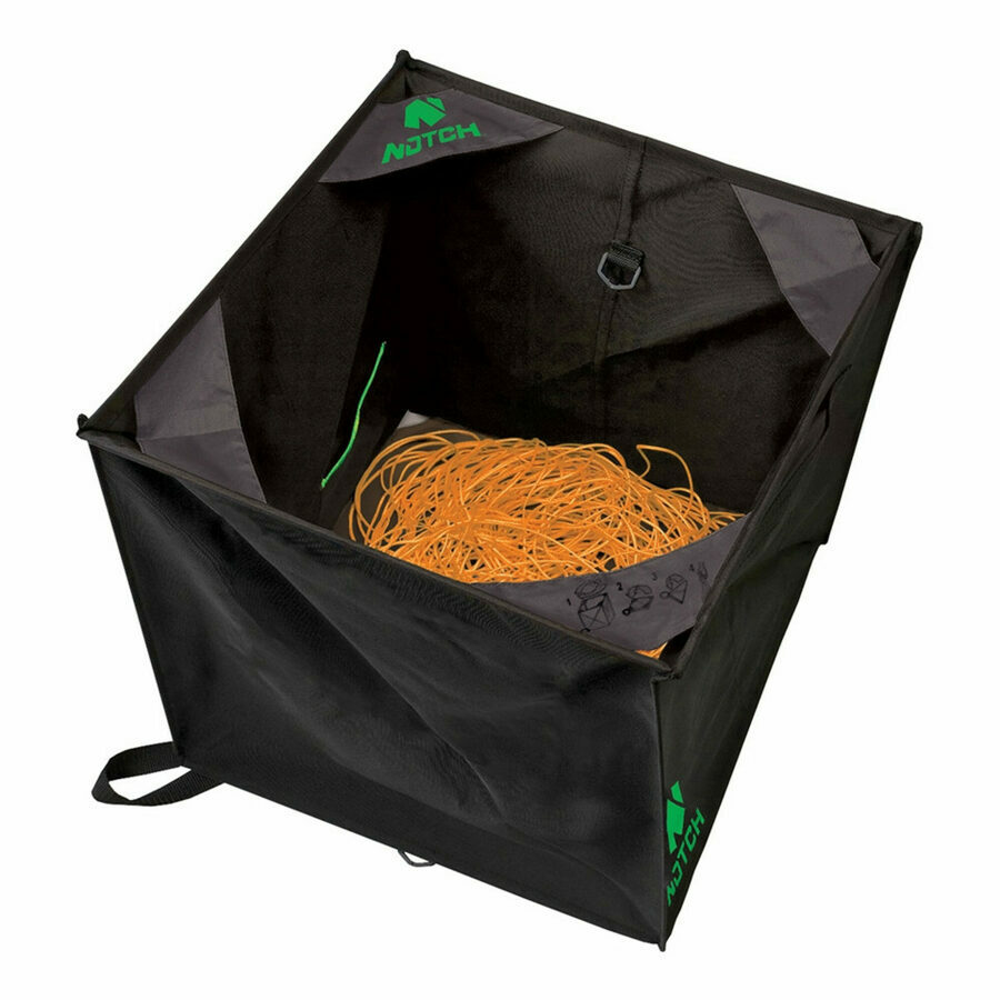 Description: The Notch Throwline Folding Cube holds up to 2 throwlines while keeping ends isolated and organized, 4 weights, and various accessories. Folds to compact portable size. Just as effective at dispersing line during the throw as it is at receiving line being retrieved, the Notch Cube Fold & Hold Deluxe folding throwline cube can be used on the ground or in the tree with equal effectiveness