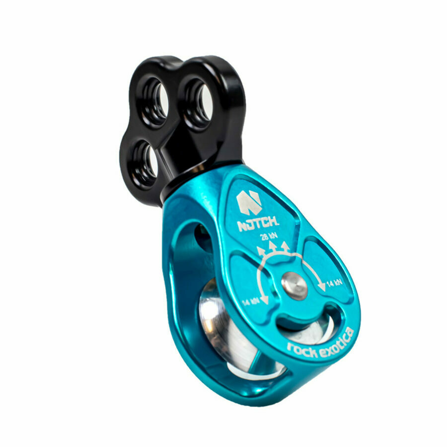 Description: The Notch ROOK is a Triple Attachment Swivel Pulley and is made by world class manufacturer Rock Exotica in the USA. Made for lines up to a half-inch, the swivel design maintains alignment. The Notch ROOK's three connection points turn this into a tool of many options and uses. Use on a rope bridge, or as a prusik-minding pulley, or on a lanyard/flipline, or even as a redirect.