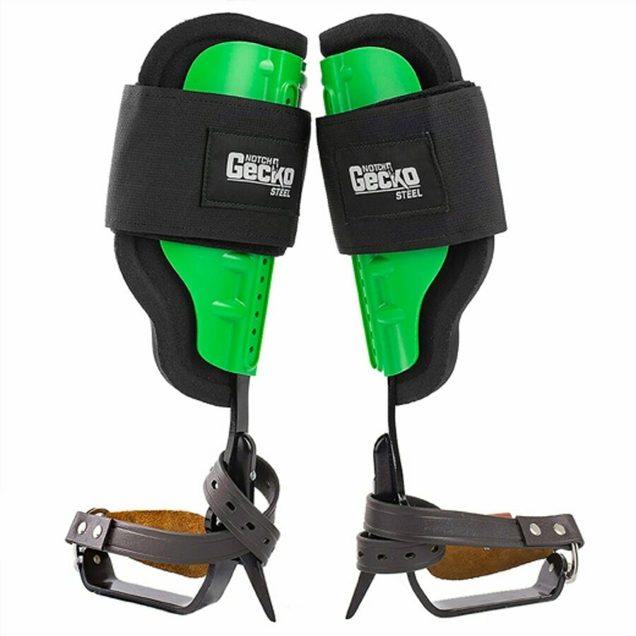 Description: The Notch Gecko Steel Climbers provide all the comfort and ergonomics of the premium climbers, but without the price. Developed by Notch Equipment for arborists, the Notch Gecko Steel Climbers feature a molded cuff made from high impact resistant plastic, high-density EVA padding, and 4" wide upper calf strap. The Notch Gecko Steel Climbers will keep you comfortable all day and stand up to the abuse of any job, and they're backed by a lifetime warranty.