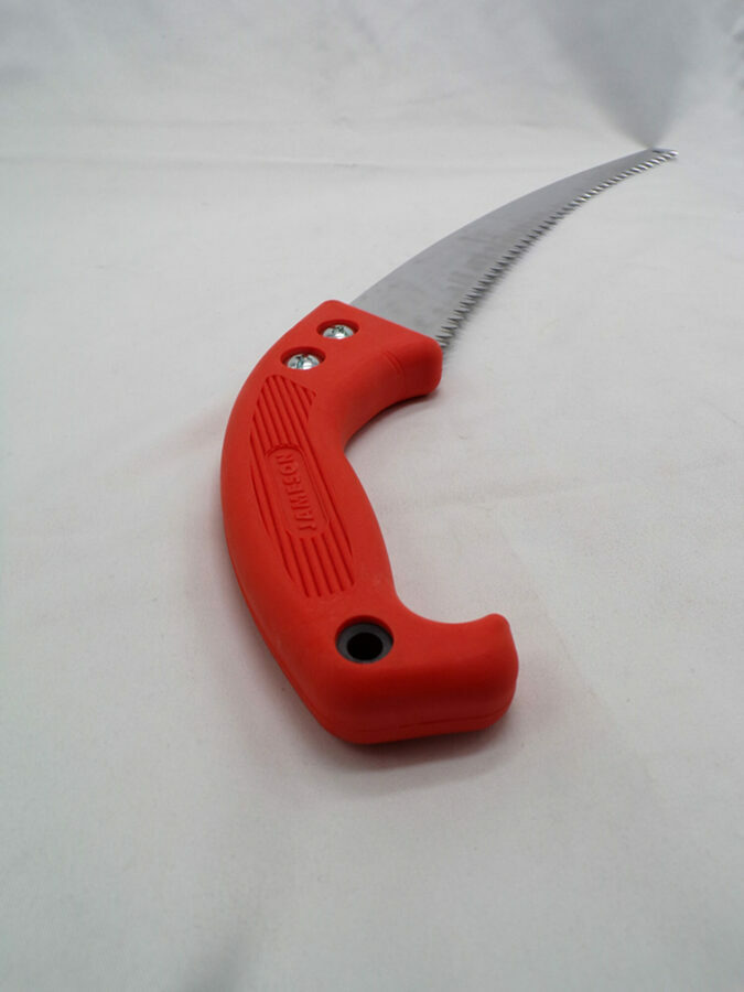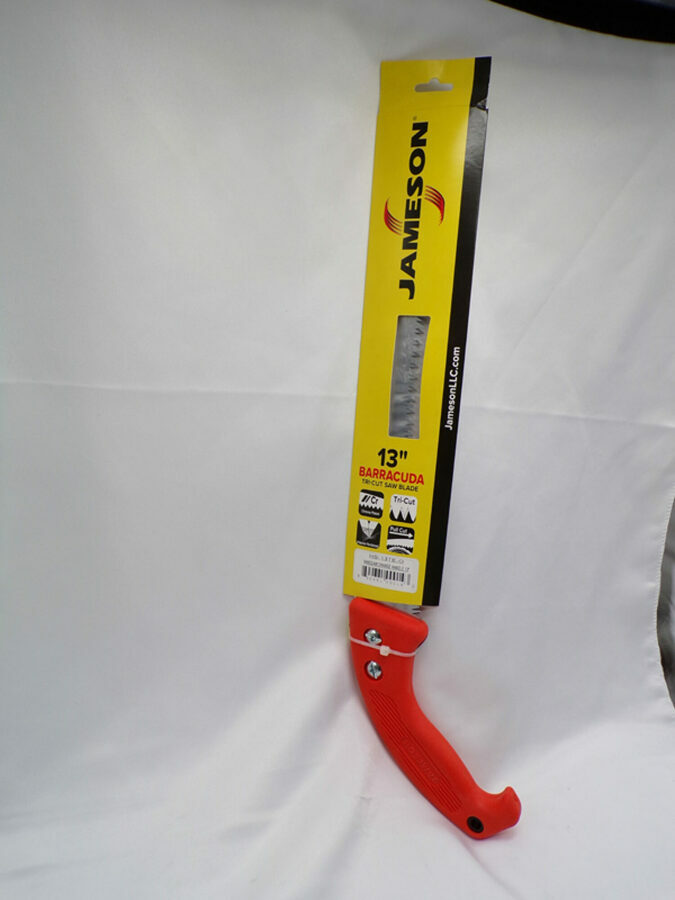 Description: Hand Saw features a 13" Barracuda™ Tri-Cut Saw Blade with orange ergonomic soft grip handle. Jameson's Barracuda impulse hardened tri-cut teeth provide an efficient and clean cut. The ergonomic soft grip handle offers index finger stop for safety and opening for lanyard line. The blades are replaceable.
