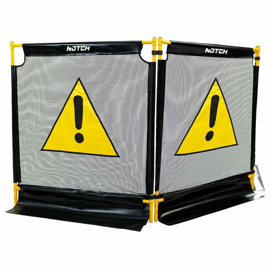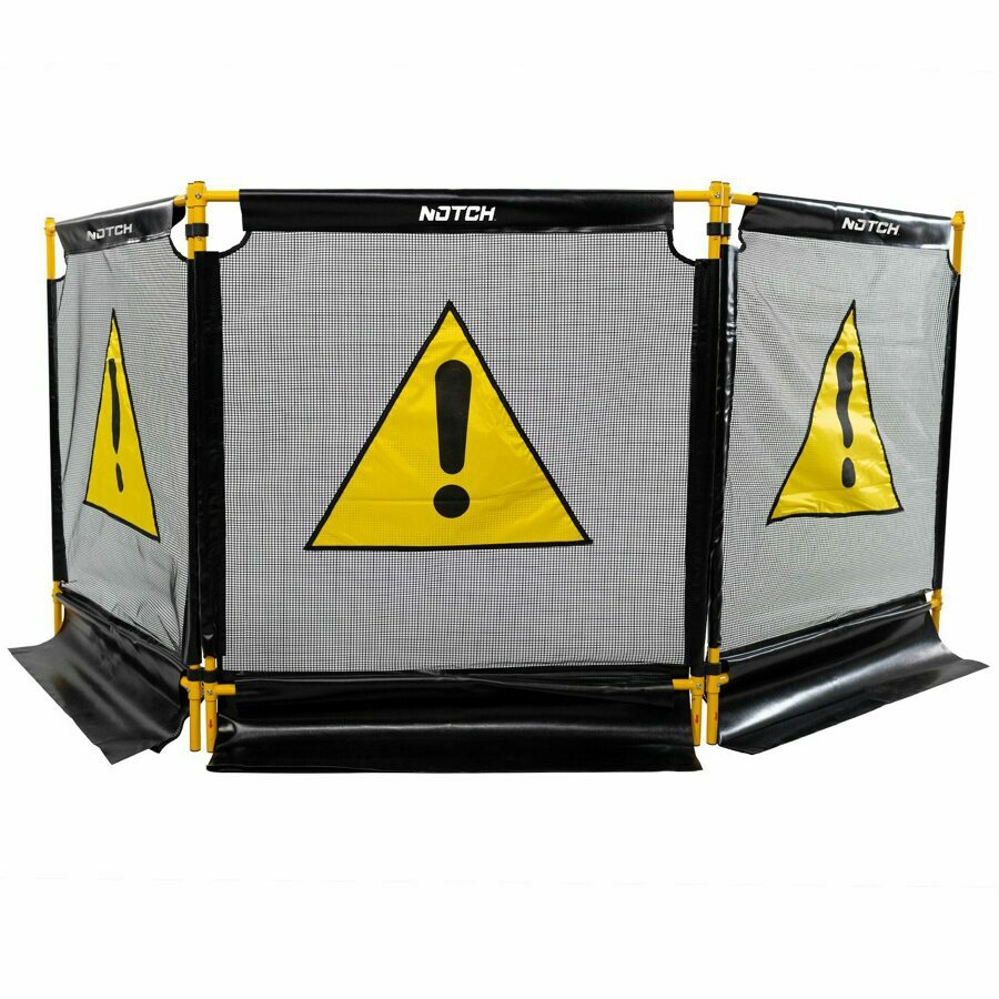 Easy one-time assembly (30 min) Instructional Video included Universal sign to alert bystanders to danger area Minimizes cleanup time Minimizes risk of flying debris Heavy-duty construction with improved structural stability Durable tri-folding construction for easy setup and storage Adjusts to uneven surfaces Stable, even in windy conditions Nylon coated heavy-duty mesh Mesh panel is cross-compatible between original Tri Guard and Tri Guard II