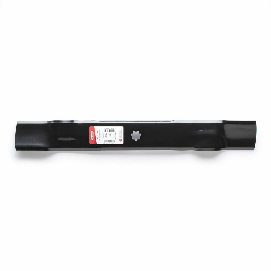 Description: Our Oregon® 100 Series lawn mower blade is made from Boron steel, which allows for the perfect balance of durability and ductility. With the Ultra X-tended Cutting Length™, the 192-106 has improved cutting efficiency per rotation. The double bevel technology helps reduce overall blade noise by up to 1.5 decibels.