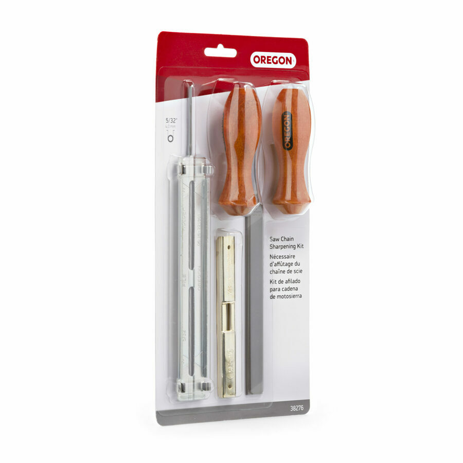 Description: Saw chain sharpening kit with all the necessary components for maintaining the chain including one assembled 5/32" file guide, two wooden file handles, one 5/32" round file, one flat file and one .025" drop-center depth gauge tool.