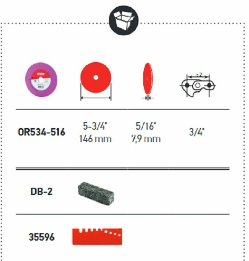 Includes grinding wheels for sharpening 3/4" pitch chain and depth gauge grinding, a dressing brick and a quick template.
