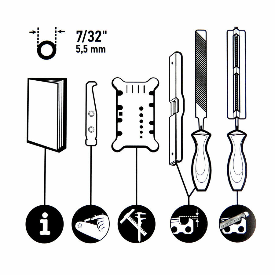 Description: Essential for the maintenance of chain saw chains and guide bars, this complete 7/32" set provides all the tools a professional needs.