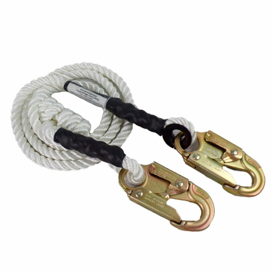 Description: Our adjustable lanyards are made from 3 strand twisted polyester rope or double braided polyester with hand spliced eyes. Shrink tubing forms a tapered cover over the tails while the forged alloy steel, double locking safety snap hook is tested and rated at 23 kN (5,000 lbs).