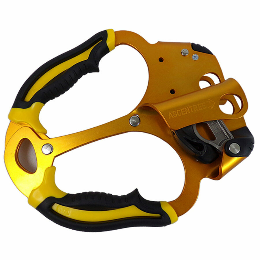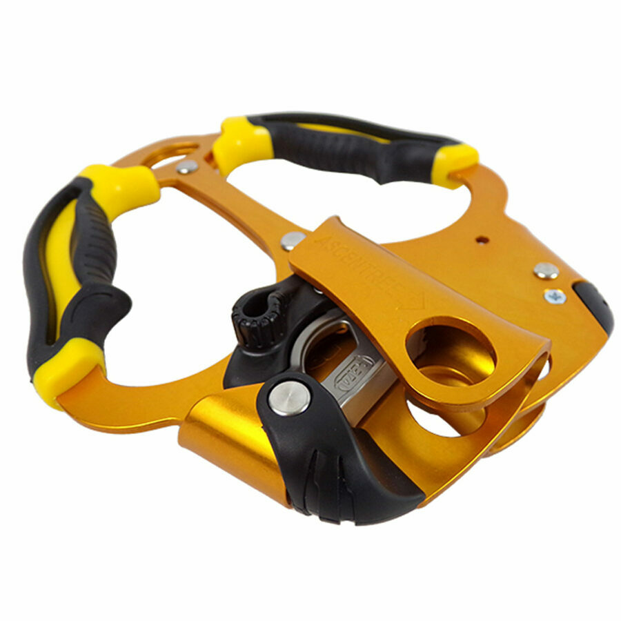 Description: Handled rope clamp designed for doubled rope ascents, the ASCENTREE has ergonomic handles allowing a comfortable and powerful grip when pulling. Catch/cam unit is totally integrated to prevent any involuntary snagging. Designed for ascending doubled ropes using the foot-lock technique or using two PANTIN foot ascenders. Simple and efficient to use.