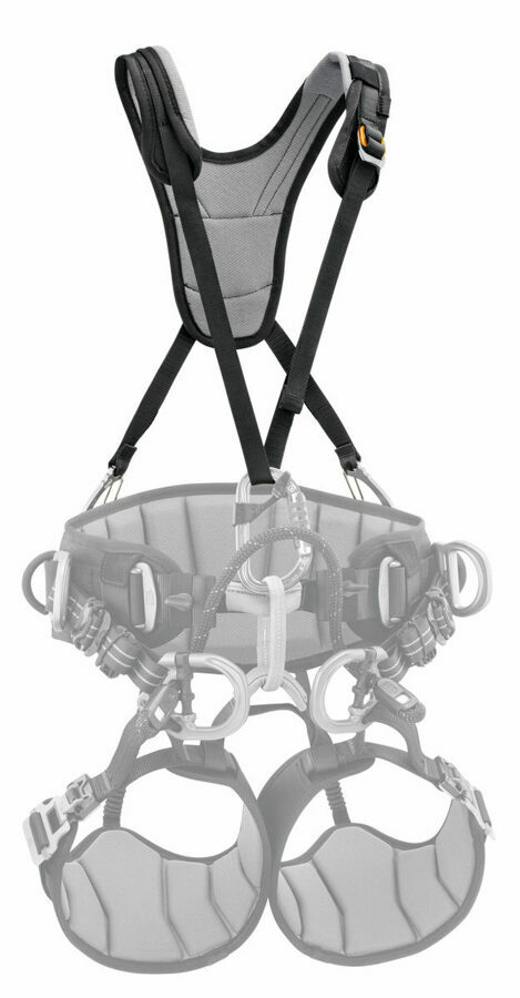 Description: Shoulder straps for SEQUOIA® SRT seat harness designed for taking the load from the waistbelt and redistributing it to the shoulders for improved comfort. They connect to the ventral attachment point of the harness and to the two slots at the rear of the waistbelt.