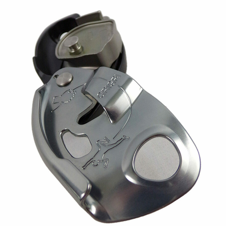 Assisted braking capability: during fall arrest, the belayer holds the free end of the rope, the cam pivots and pinches the rope, increasing the braking action until the rope stops sliding.