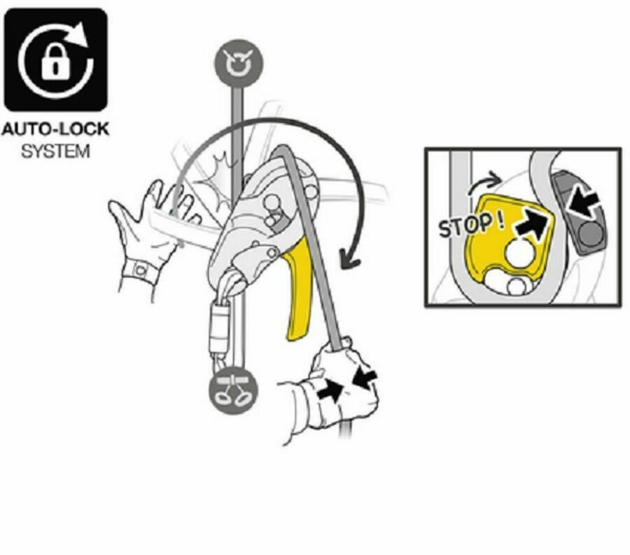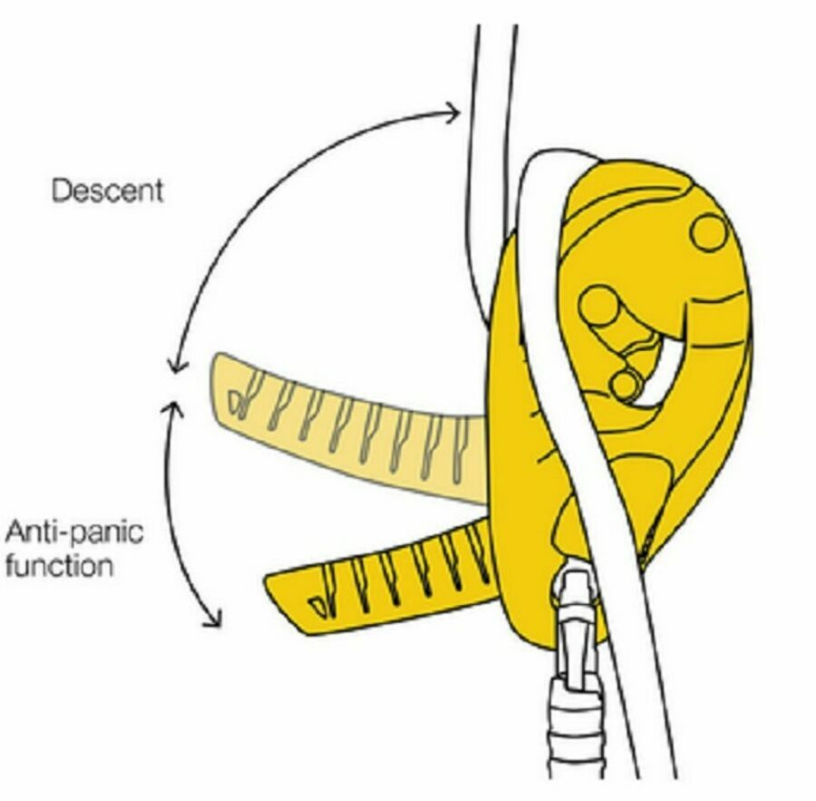 safety gate on the moving side plate allows the rope to be installed easily while the device remains connected to the harness - easy rope installation, thanks to the rope guide and markings - anti-error catch to reduce the risk of an accident due to incorrect installation of the device on the rope - ergonomic handle allows the rope to be released and enables comfortable control of the descent. Two possible descent modes: on the side plate or in the V-shaped friction channel - anti-panic function automatically stops the descent if the user pulls too hard on the handle - allows smooth movement along inclined or horizontal terrain - The AUTO-LOCK system allows users to easily position themselves at a workstation without having to manipulate the handle or tie off the device: as soon as the user releases the handle, the rope is automatically locked in the device. The automatic return system on the handle limits the risk of the device getting accidentally snagged - handle automatically switches to storage position when the rope is removed from the device, reducing the risk of accidental snagging when the descender is carried on the harness