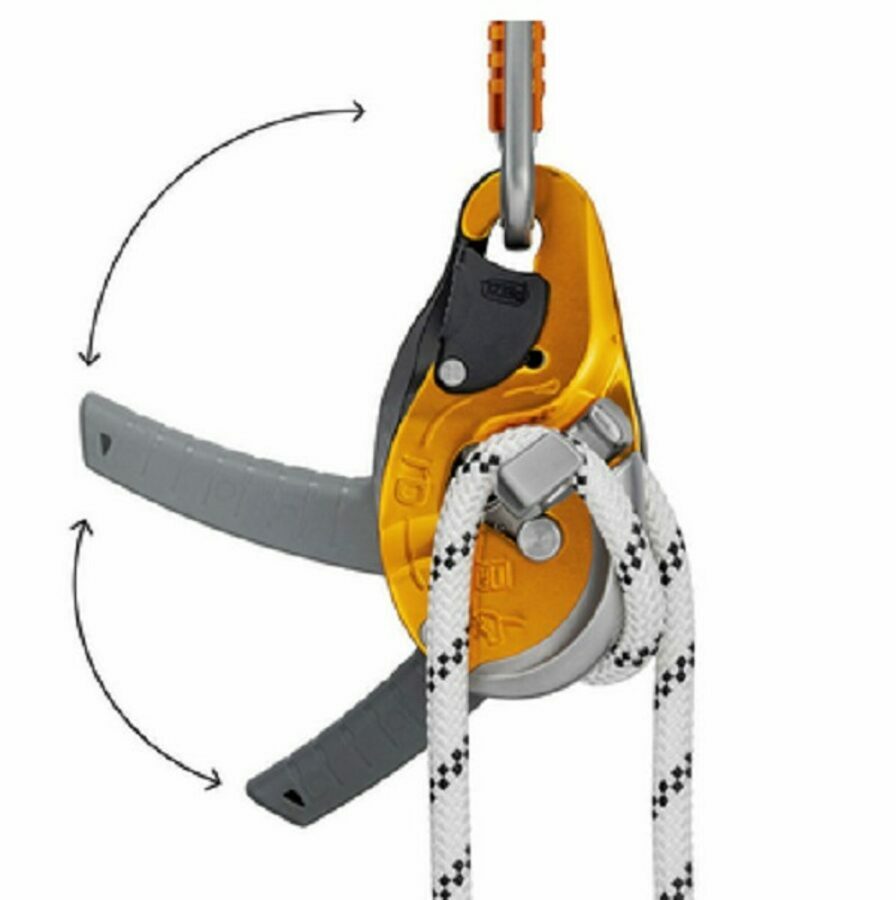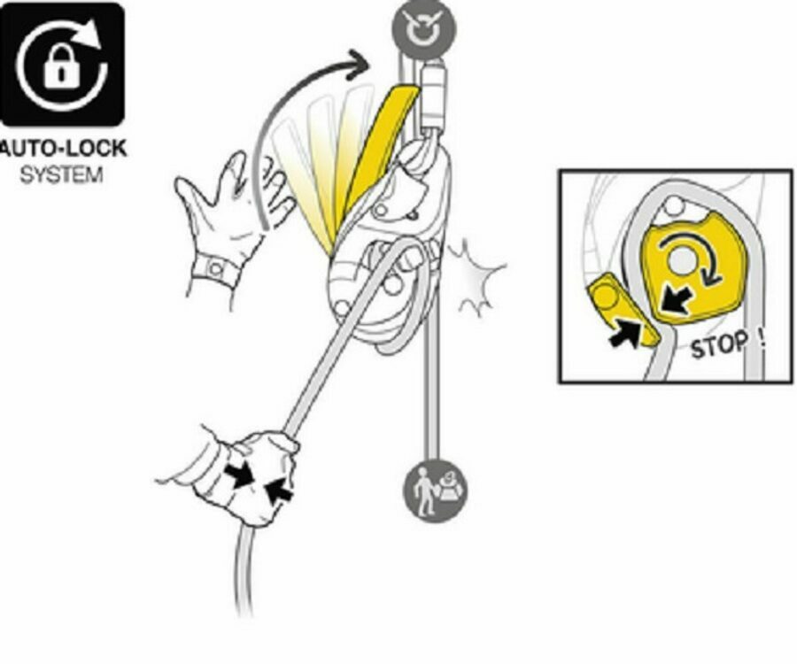 The AUTO-LOCK system allows the rope to be automatically locked without having to manipulate the handle or tie off the device. The automatic return system on the handle limits the risk of the device getting accidentally snagged